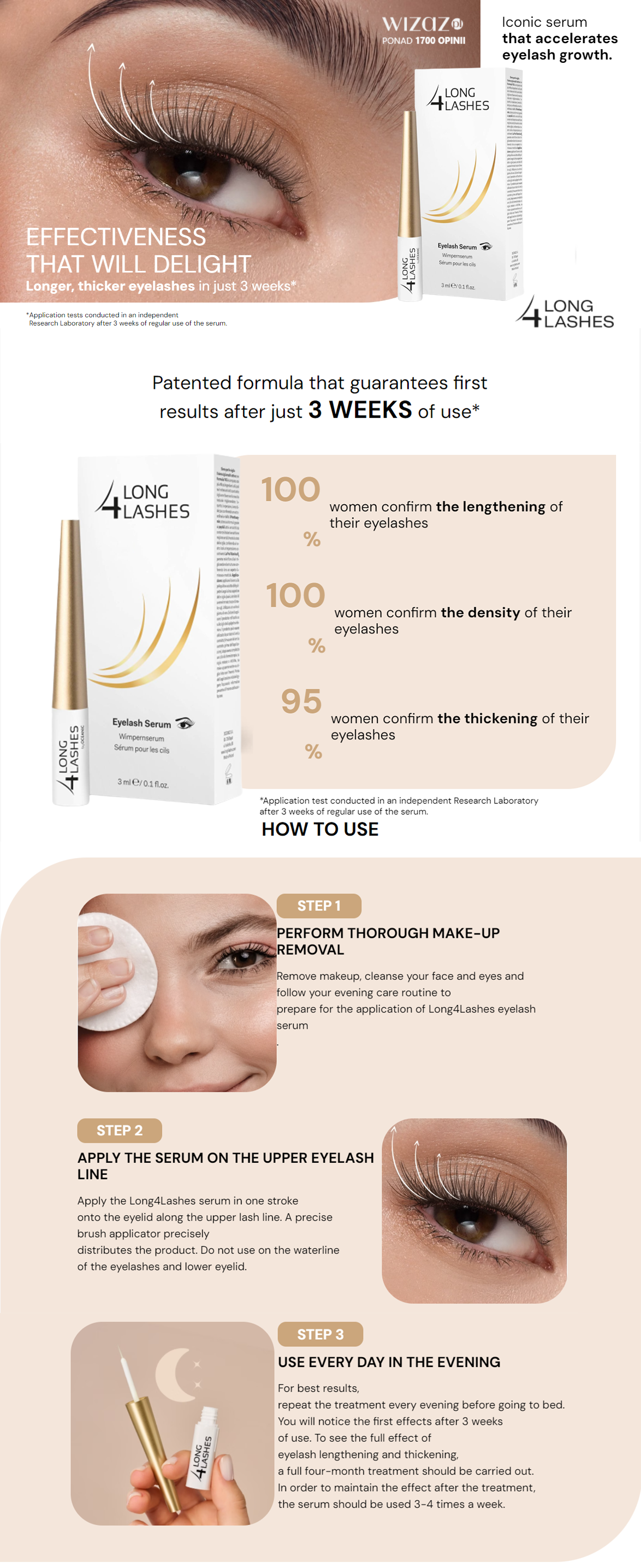 يعمل السيرم على إطالة وتكثيف وتقوية الرموش وتحسين حالتها بشكل واضح. تحتوي تركيبته على مجموعة من المواد الفعالة، التي تعتبر حاليا من أكثر المركبات فعالية في تقوية الرموش، وذلك بفضل تأثيرها على جميع مراحل حياة الشعر. إن إثراء المستحضر بحمض الهيالورونيك له تأثير إيجابي على مستوى ترطيب الرموش وينعم سطحها، كما يعمل البروفيتامين ب5، الذي يخترق ألياف الشعر، على تحسين بنيتها – فهي تصبح أقوى وأكثر مرونة ولامعة.